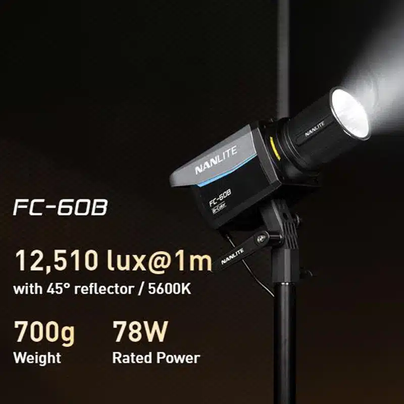 Don’t let the FC‑60B’s size fool you — this ultraportable spotlight packs a hefty 60 W punch and delivers up to 12,510 lux at 1 m with its mini reflector, making it ideal for on-the-go creators